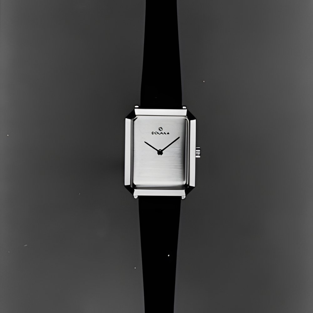 Contrasting with current curvilinear styling but nonetheless very modern in its eloquent simplicity, this lady’s silver watch provides a good example of the individual character prevailing in watch design. And its sharp angles, straight lines and buffed surface compose a striking combination. (GOLANA)