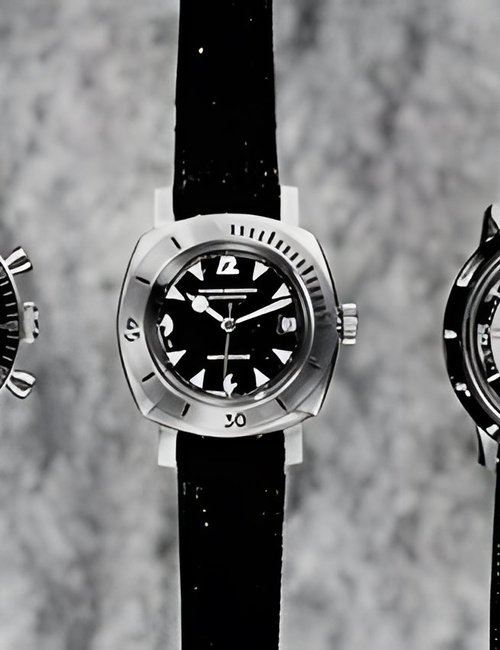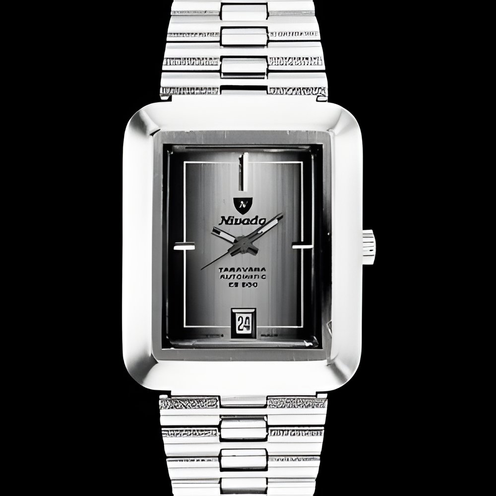 Neat straight lines are back, as this model shows, but corners remain rounded rather than sharp. High frequency (28,800 v,ph.) automatic movement, water-resistant case and ca1endar. (NIVADA “Taravana”)