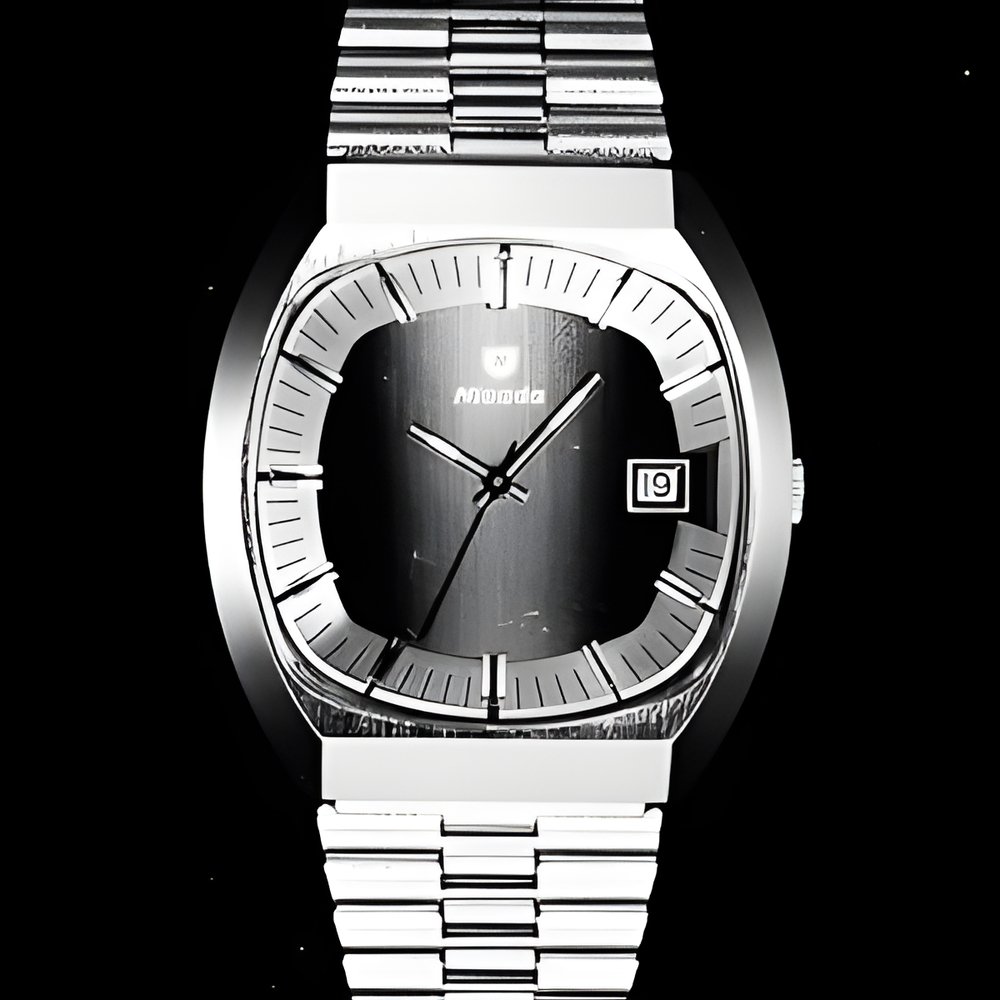 European Watch Clock and Jewellery Fair 1974 BF 137 A new model in Nivada’s “Leonardo Da Vinci” collection. All-steel waterresistant case with rounded sides and polished bevelling. Inside, a calendar automatic movement (NIVADA “Leonardo Da Vinci II”)
