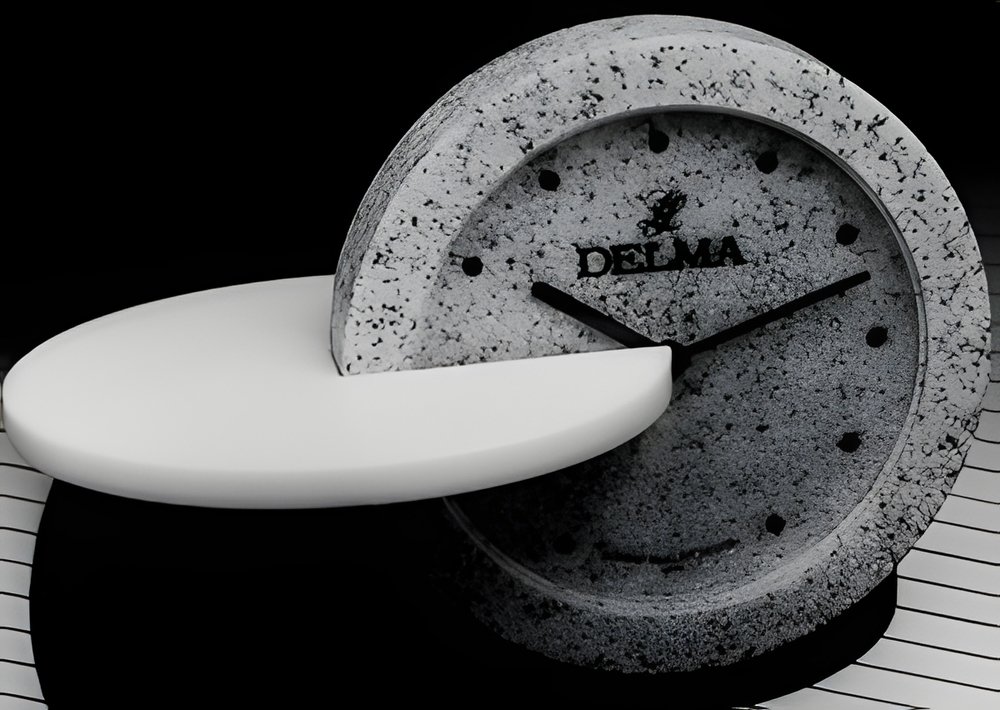 “The Rolling Stone” is how Delma calls its newest table clock. It is made of Conan, a new substance made from stone and epoxy resin that is particularly resistant to shocks and corrosion. Two similarly shaped elements are “plugged” into each other at a 90-degree angle, resulting in a perfectly harmonious construction : the clock itself may roll back and forth but always returns to its place. (DELMA “The Rolling Stone”)