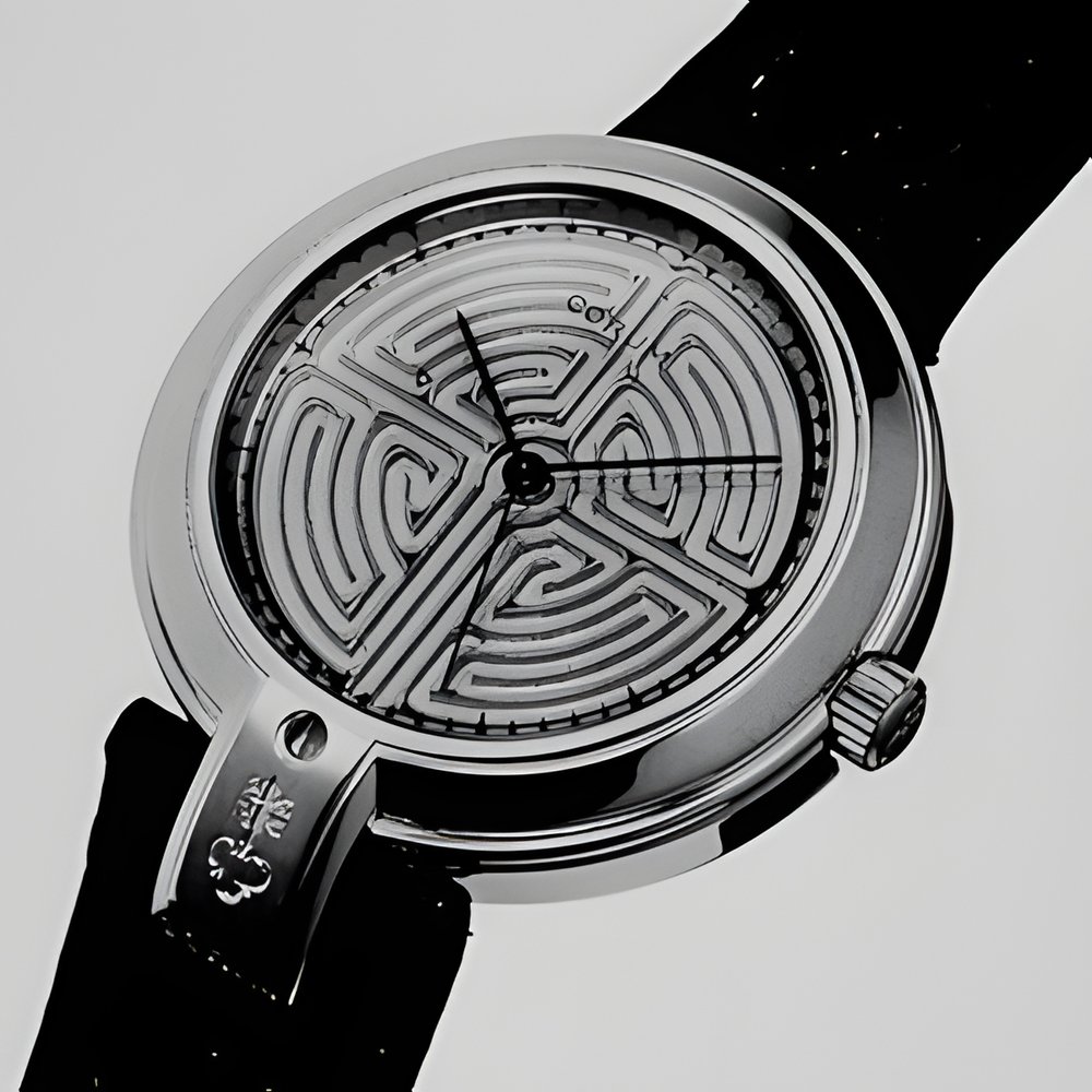 Corum’s “Labyrinthe” design features a simplified reproduction of the labyrinth in the cathedral at Chartres (*). A tiny sphere wends its way through the channels cut in the watch’s solid gold dial. With waterresistant case and dial in yellow or white gold. Also available in steel and 18K gold. Selfwinding movement. (CORUM “Labyrinthe”)