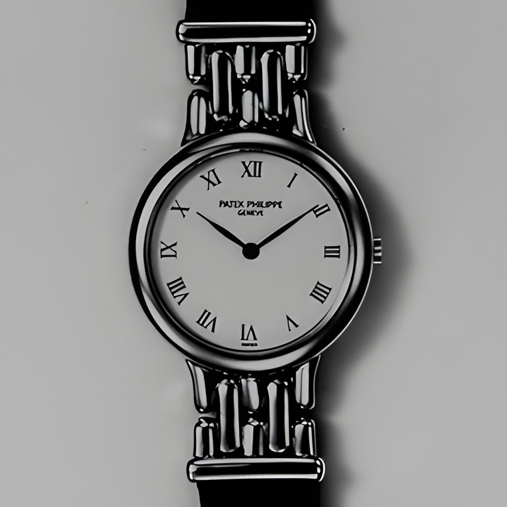 A Patek Philippe design for women, featuring a round yellow gold case with rounded bezel and lugs. Its white dial features 12 black painted Roman numerals. Quartz movement. (PATEK PHILIPPE)