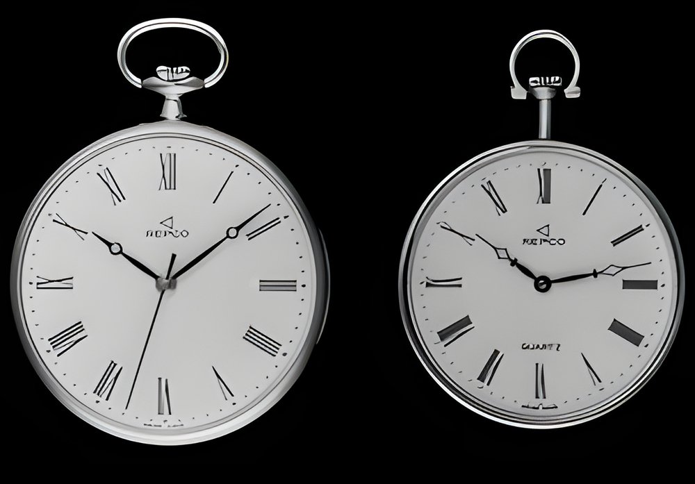 Yellow 18K gold case, white dial inscribed with Roman numerals - the epitome of classic elegance. The larger of these pocket watches holds a 17-jewel mechanical movement, with centre seconds hand. The smaller one is fitted with a quartz movement. Very slim case lines. (REPCO WATCH SA)