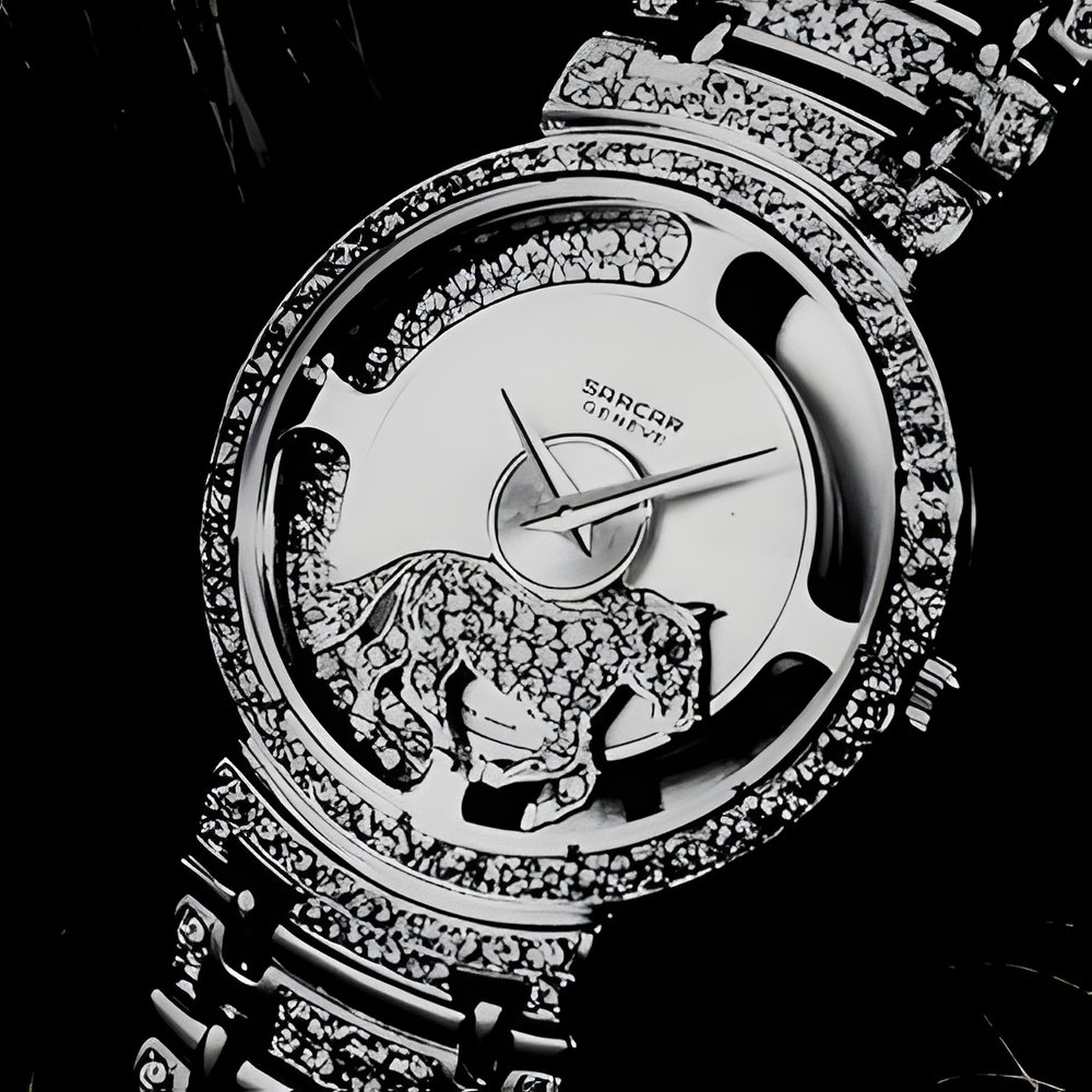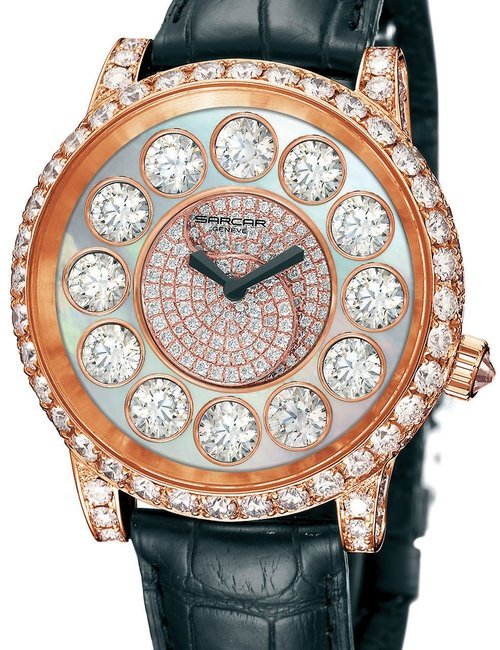 Crafted in yellow or white 18K gold and set with .73 carats of brilliantcut diamonds, this “Magic Moon” jewellery watch from Sarcar features a small, ruby-eyed “galloping horse” motif that circles around the dial at :ì the wrist’s merest movement. (SARCAR “Magic Moon”)