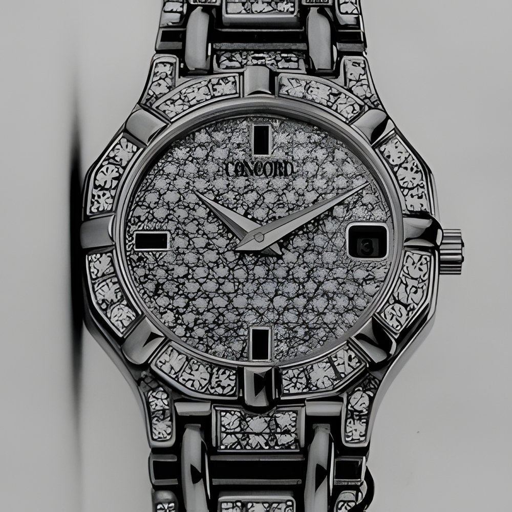 Concord’s “Saratoga” design is surely one of the most typical designs found in the Swiss watch industry : round dial, eight-sided bezel featuring eight “claws” and a large bracelet totally integrated with the case. On this model, light plays with polished and brush-finished gold, the gleam of diamonds and the ruddy depths of fine rubies. (CONCORD “Saratoga”)