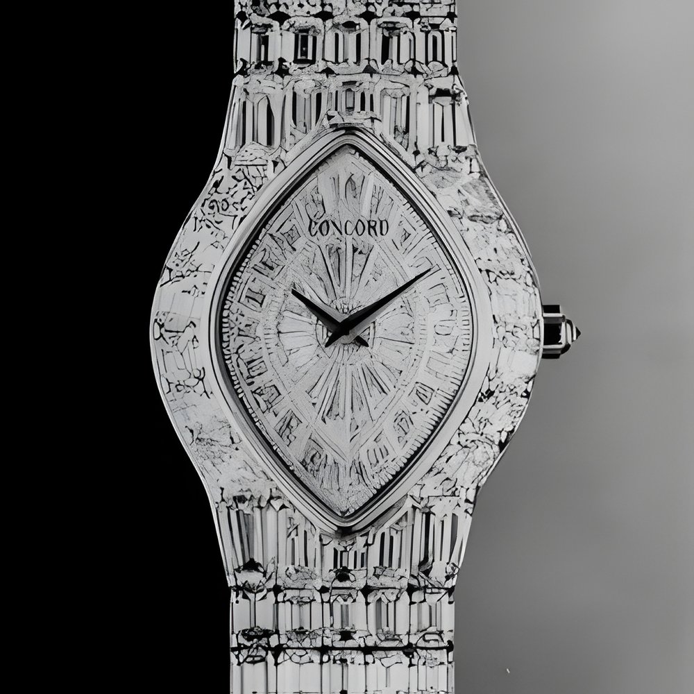 This original Concord design required a maior investment in both raw materlais and craftsmanship. Diamonds are Top Wesseiton colour of If pureness grade. They have been individually cut and polished by hand, implying a 20% average weight loss. Some 230 hours of cutting and 106 of polishing were needed before adorning this watch with its 284 diamonds whose net weight totals 32.014 carats. A model for men is also available, fitted with an 18K yellow and white gold frame set with 14.29 diamonds with a net weight of 51.80 carats. (CONCORD “Mira”)