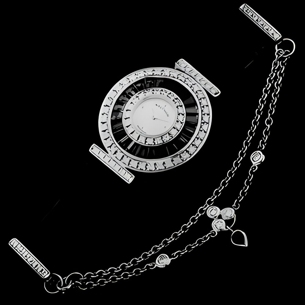 Waltham’s “Arc-en-ciel” (“Rainbow”) model features gemstones with the jeweller’s touch. The case is set with diamonds and tourmalines. The chain is made in gold, enhanced with diamonds. Gold, too, for the time-setting key. (WALTHAM “Arc-en-ciel”)