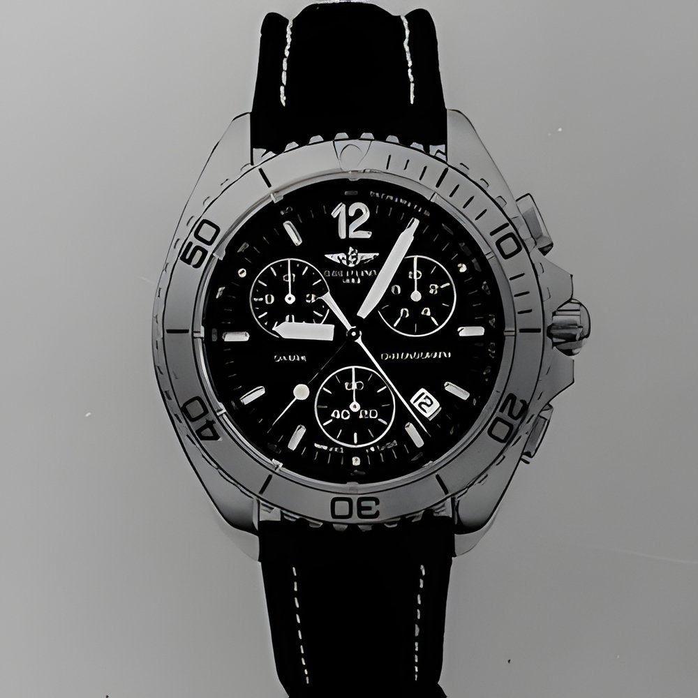 Fitted with a quartz electronic movement, Breitling’s “Shark” chronograph is depth-tested to withstand pressures to a depth of 100 m. It measures short times thanks to a centre seconds counter, a centre-positioned minute totalizer and an hour totalizer. The watch also features a split-seconds function, a time readout to 1/10th second, a small seconds hand and a date calendar, along with a fast-action hour correction system that affects neither the minutes nor the seconds. Black and white dial with tachymetric scale and tritium markings for enhanced legibility underwater and in other low light conditions. All-steel polished case, screw-locked crown and ratcheted one-way rotating bezel. Sharkskin strap. (BREITLINC “Shark”)
