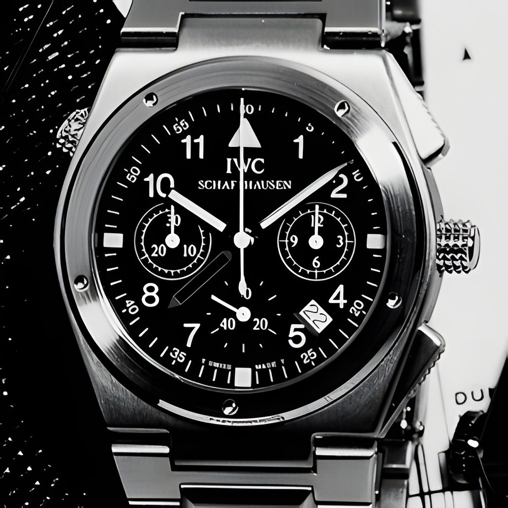 chronograph movement made that combines quartz precision and traditional mechanisms, plus an alarm device with piezoelectric release. Seven hands or pointers, one fast-setting calendar, two stop crowns, two pushpieces...and a water-resistant, non magnetic case. (IWC - International Watch Co., Schaffhausen - “Ingenieur-Chrono-Alarm”)