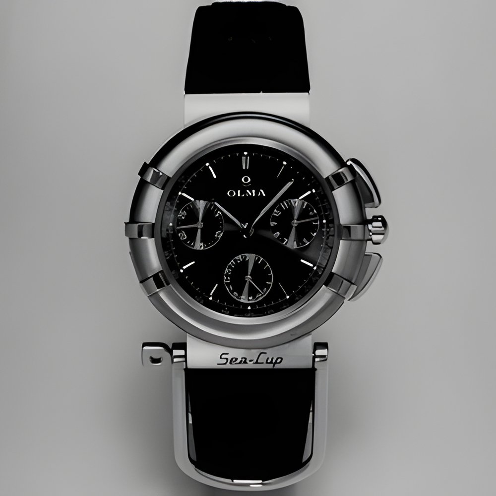 The “Sea Cup” chronograph with two-tone case, water-resistant to 50 m and fitted with a saphire crystal, is a study in elegant ruggedness. It is notable for the nautical shackle used decoratively here. Ronda 726, 12-line movement, with two totalizers, 30-minute and 12-hour, plus a date calendar subdial at 6 o’clock. Choice of case styles : stainless steel, two-tone goldplate, blue titanium nitride (PVD) with 10-micron goldplate trim. Genuine sharkskin strap or else steel, goidpiated or blue PVD metal bracelet. (OLMA “Sea Cup” Chronograph)