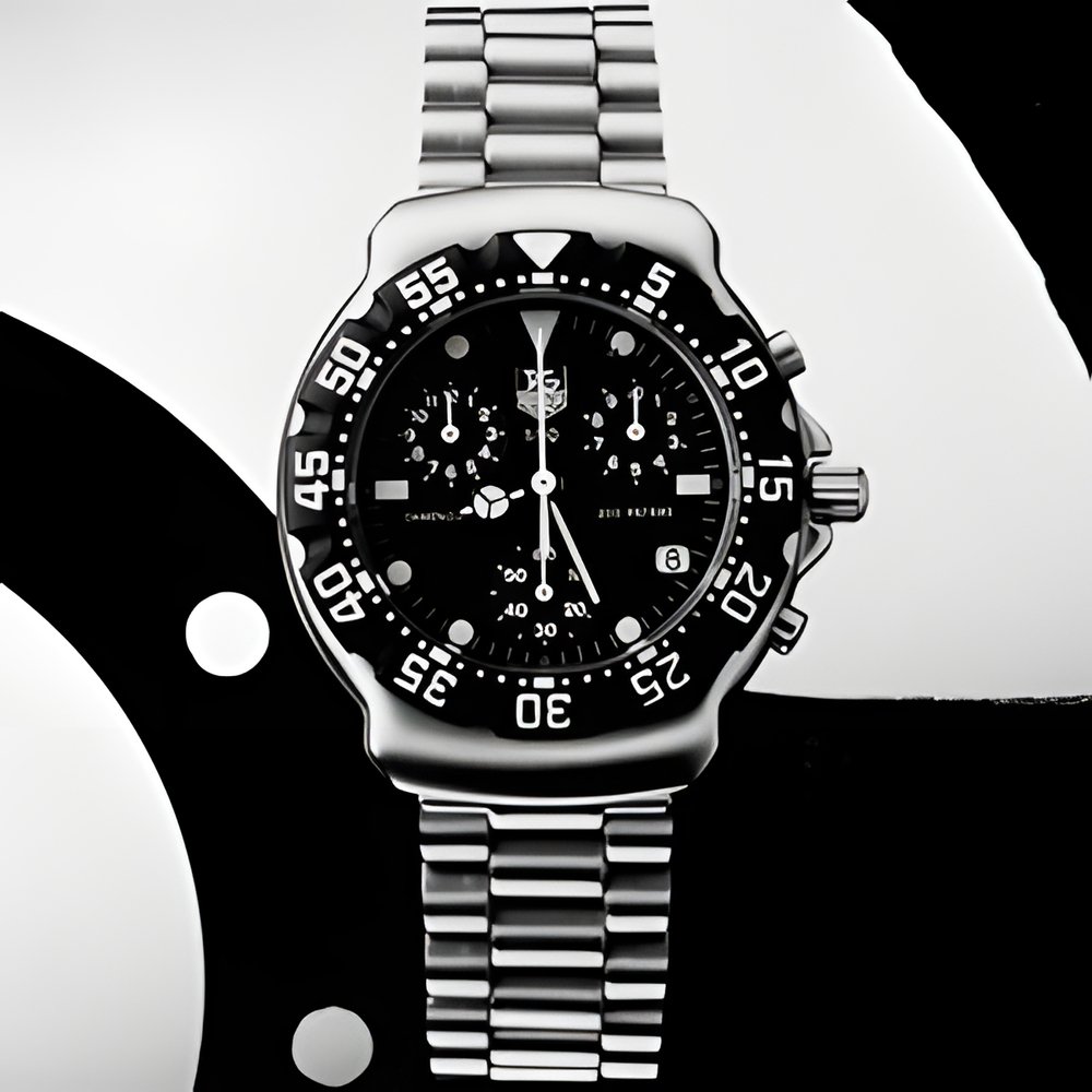 TAG Heuer’s “Formula 1 Chronograph” features a quartz movement equipped with five micromotors, one for each totalizer function (12-hour and 60-minute totalizers, seconds counter, 1/10th second display and time-display functions). Basic chronographic functions plus split, intermediate and instantaneous times. Stainless steel case water-resistant down to 200 m, screw-locked crown, ratcheted one-way turning bezel, safety-lock bracelet. (TAG HEUER “Formula 1 Chronograph”)