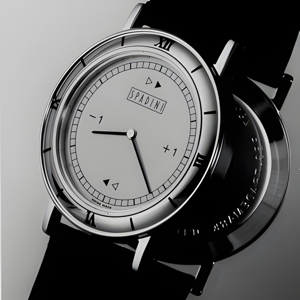 The Magic Touch crowniess watch set directly by pressing on the watch crystal is available with a further refinement, now in volume production a new micromotor, driven by a special integrated circuit, allows the hands to be driven backward as well as forward. Furthermore, time changes can be effected in precise one-hour increments, in either direction. Quartz movement. (SPADINI “Magic Touch”)