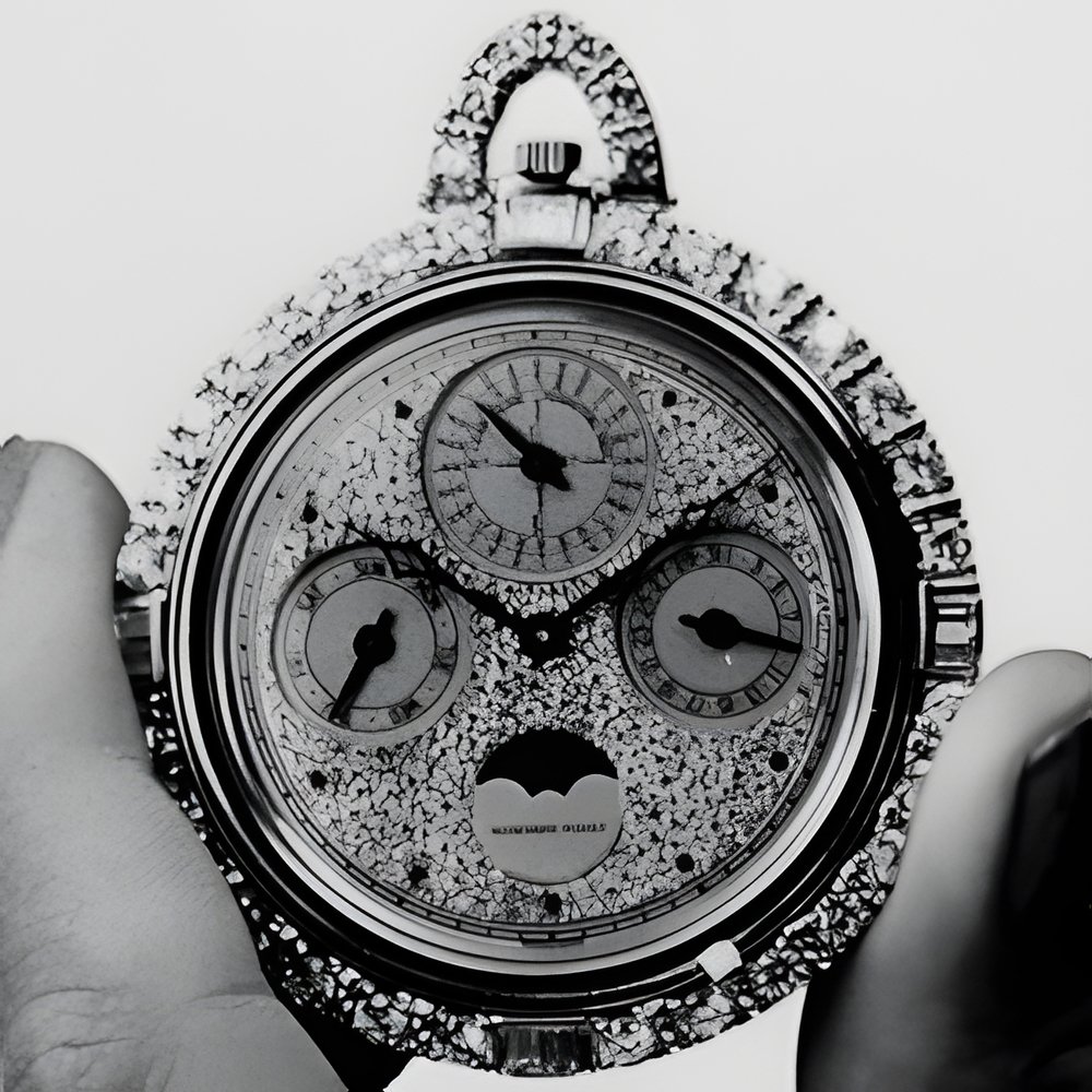 Time in the grand tradition : a prestigious pocket watch with perpetual calendar (date-day-month-leap years) and phases of the moon. Its yellow gold case is set with 36 brilliant-cut and 8 baguette-cut diamonds (4.41 carats in all) while the diamondpavé dial features ruby hour markers. (AUDEMARS PIGUET)