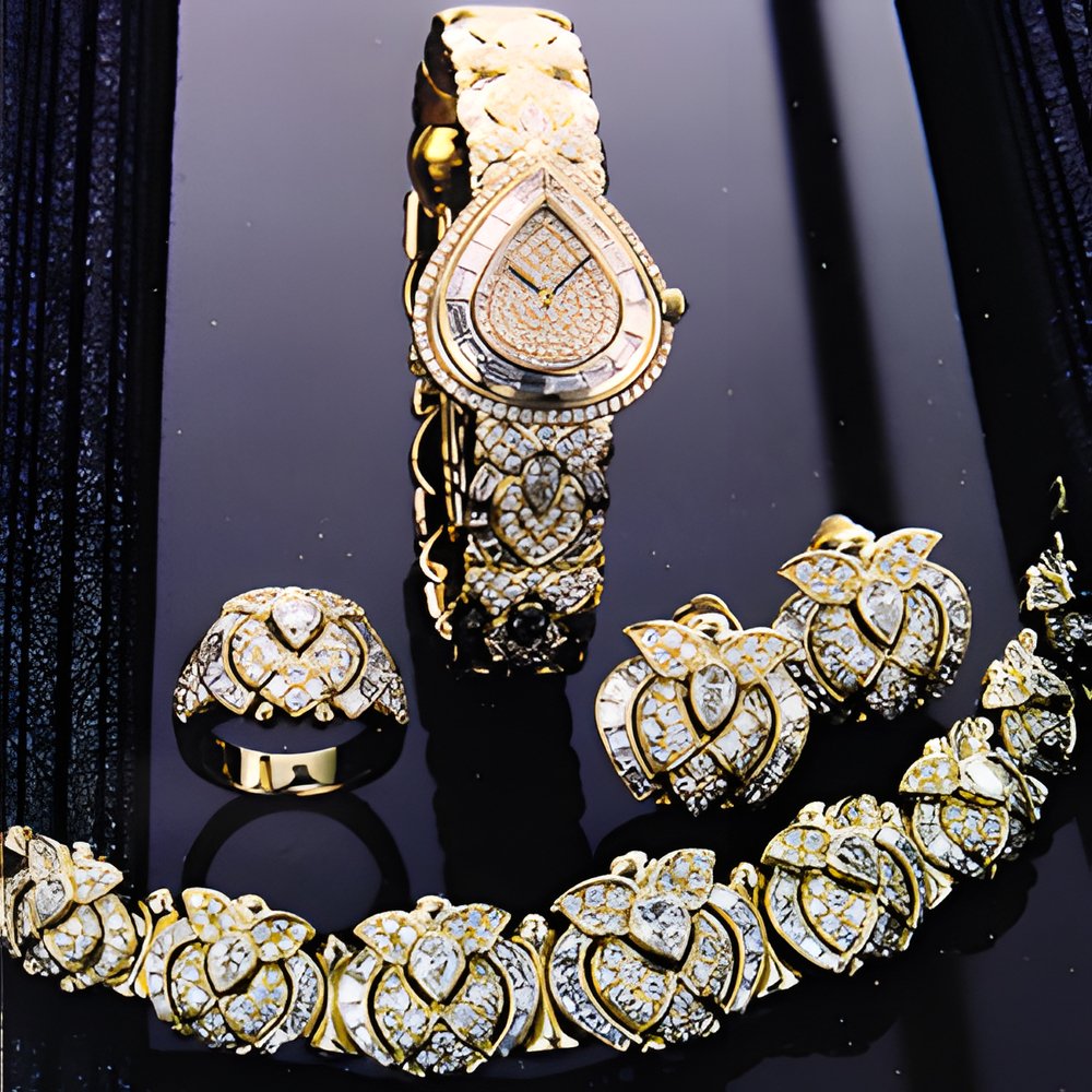 The «Taj Mahal» suite was designed in respectful salute to the famed white-marble mausoleum in Agra, India. The 18K yellow gold wristwatch is set with 6 carats of brilliantcut diamonds, 12 carats of baguette-cut diamonds and 2.3 carats of pear-cut diamonds. It contains a quartz-piloted movement. A ring, a necklace and earrings round out this dazzling 18K yellow gold jewellery set enhanced with 26 carats of variously cut diamonds.