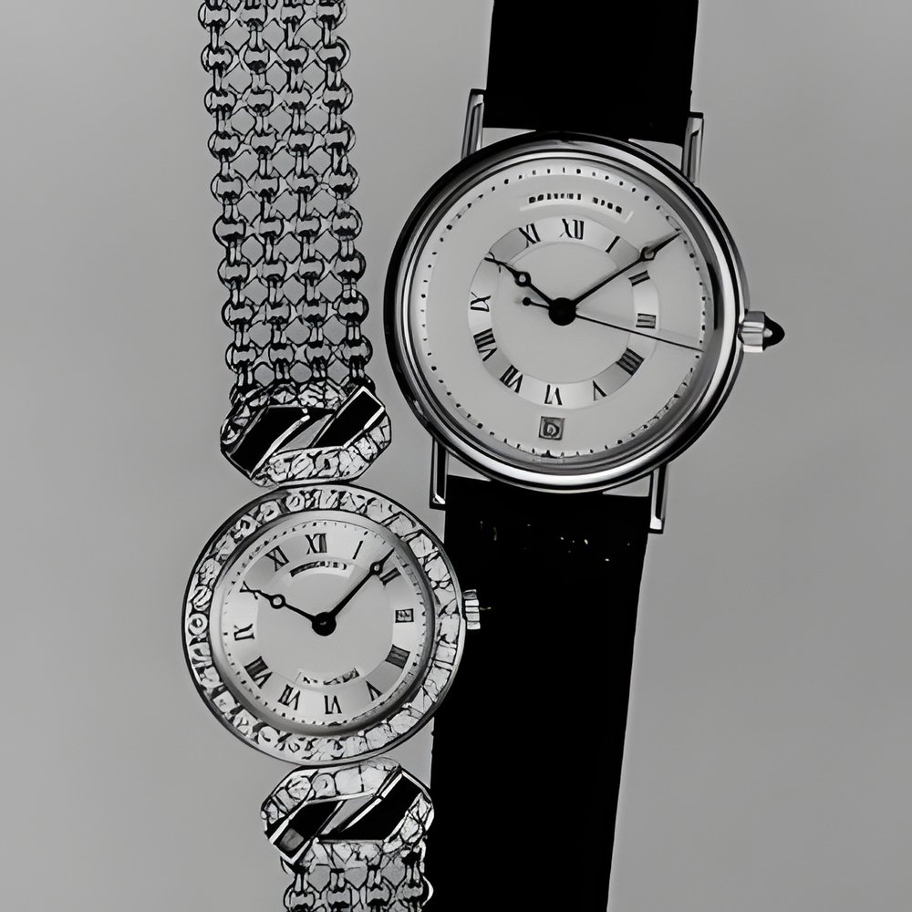 This pair of Breguet designs in 18K gold display serenely classic lines. The woman’s model features 72 diamonds and 8 baguette-cut 00
