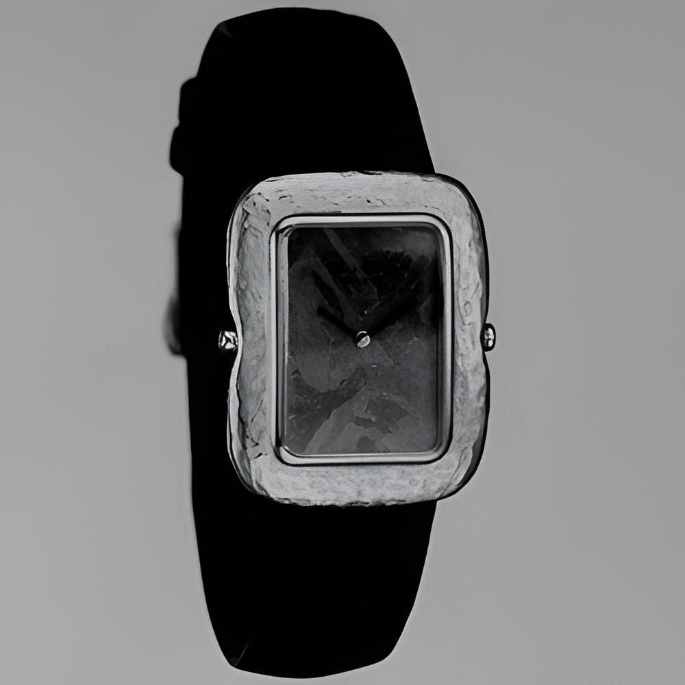 Thirty years ago, Gilbert Albert was the first to design watches and jewellery incorporating meteorites. A Gilbert Albert creation, this man’s wristwatch is made of unusually pure (22K) finely hammered gold. Its dial is composed of a plate of siderite (meteoric metal). For perfect aesthetic balance, this model features two crowns, at 3 and 9 o’clock. (GILBERT ALBERT)
