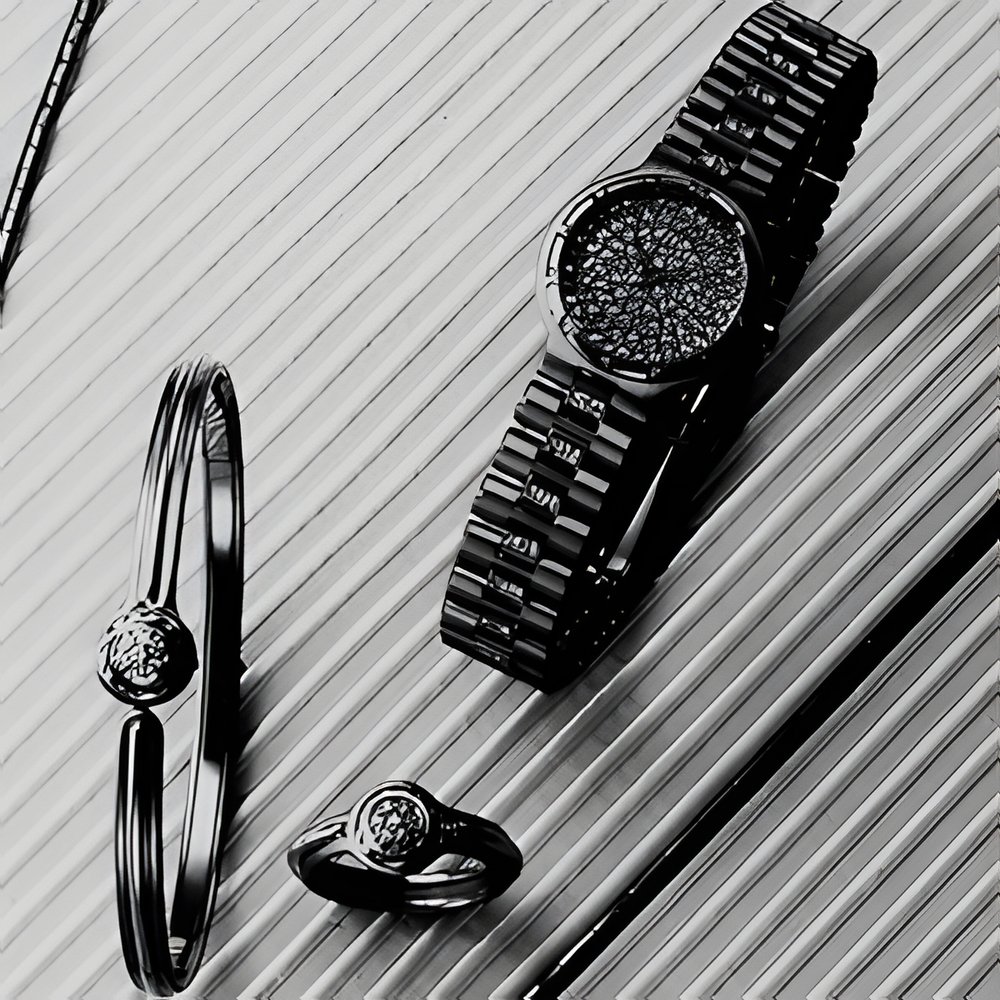 An 18K gold set of feminine jewellery from Longines. The quartz watch features a diamond-set bracelet as well as a diamond pavé dial. The bracelet, ring and pendant also comprise diamond-pave motifs. (LONGINES)
