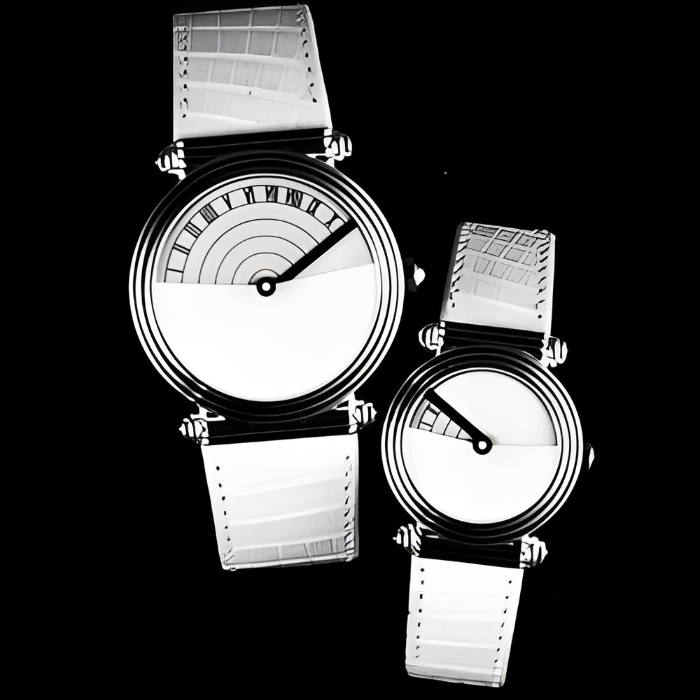 New Chopard Genève designs with linear time display (sectorial system) by means of a moving sapphire disc with a red line. Cases, in 18K yellow gold, are water-resistant. White alligator straps. Bracelet links and crown enhanced with cabochon sapphires or rubis. (CHOPARD GENEVE)
