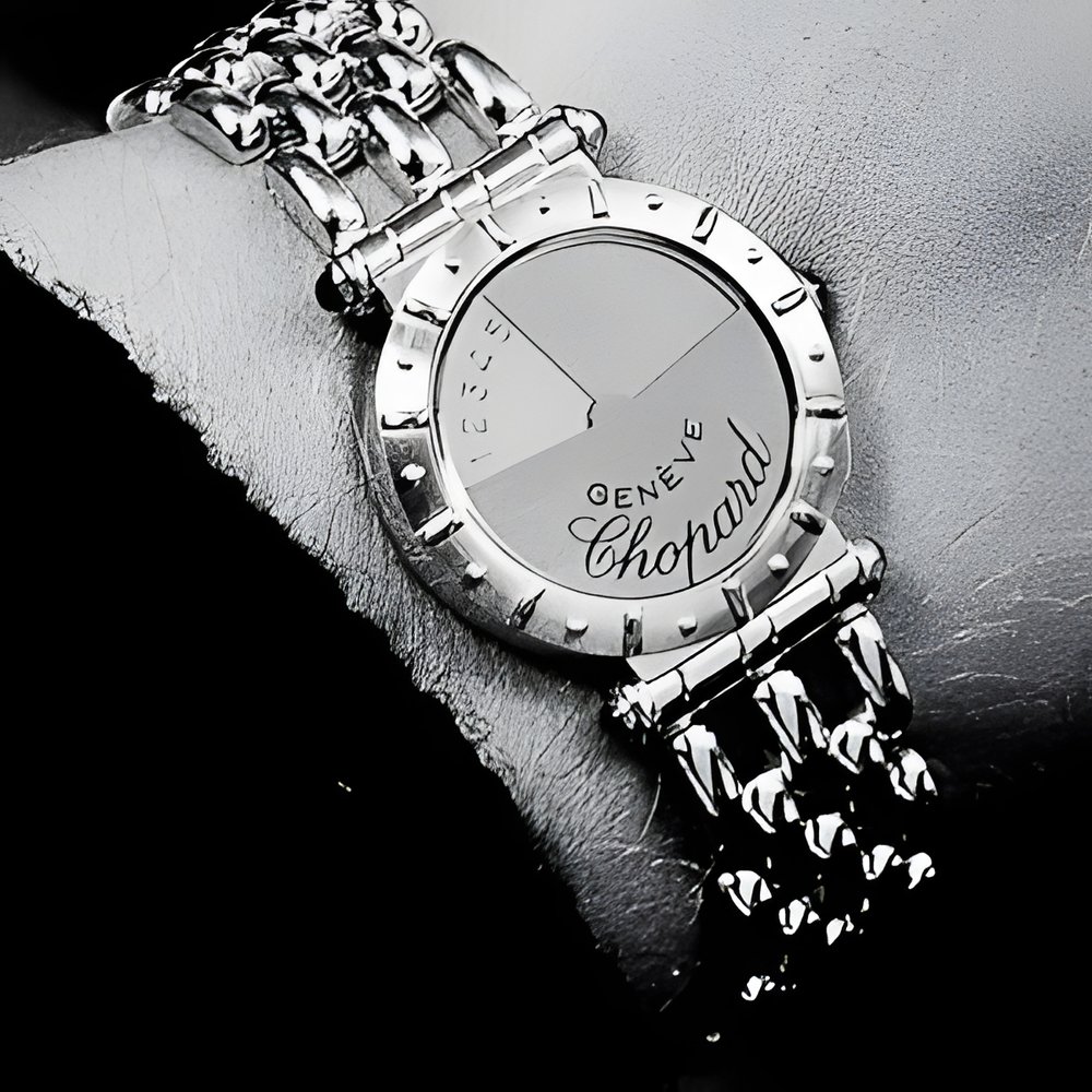 This Chopard Genève design presents a novel way to read the time the sectorial watch face. It shows the time in linear fashion (here 5:30) by means of a moving sapphire disc. Bezel in 18K white gold, hour markers in yellow gold. Rounded and polished yellow gold links compose the bracelet. The crown and bracelet links are set with sapphire cabochons. Water-resistant to 60 m. Quartz movement. (CHOPARD GENEVE)