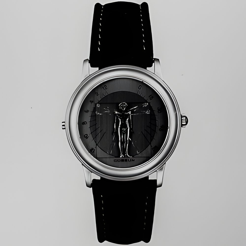 A drawing by Leonardo da Vinci provided Gübelin with the idea that led to the creation of this wristwatch, probably the only one of its kind in the world. The figure’s arms rise and fall back, showing the time on the two sectorial arcs on either side: left for the hours, right for the minutes. At the end of their sweep, the two arms automatically return to their initial, upraised position. (GUBELIN “Upraised Arms”)