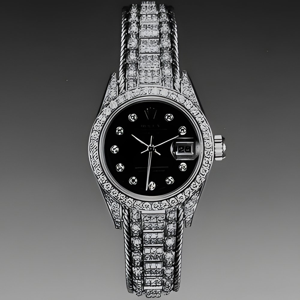 Created for Montres et Bijoux Genève 1989, this Lady-Datejust type Rolex model comes in yellow gold, with case horns, bezel and bracelet enhanced with 268 round diamonds (approx. 2.13 carats) while its ferrite dial (black flecked with white) carries ten diamonds. (ROLEX)
