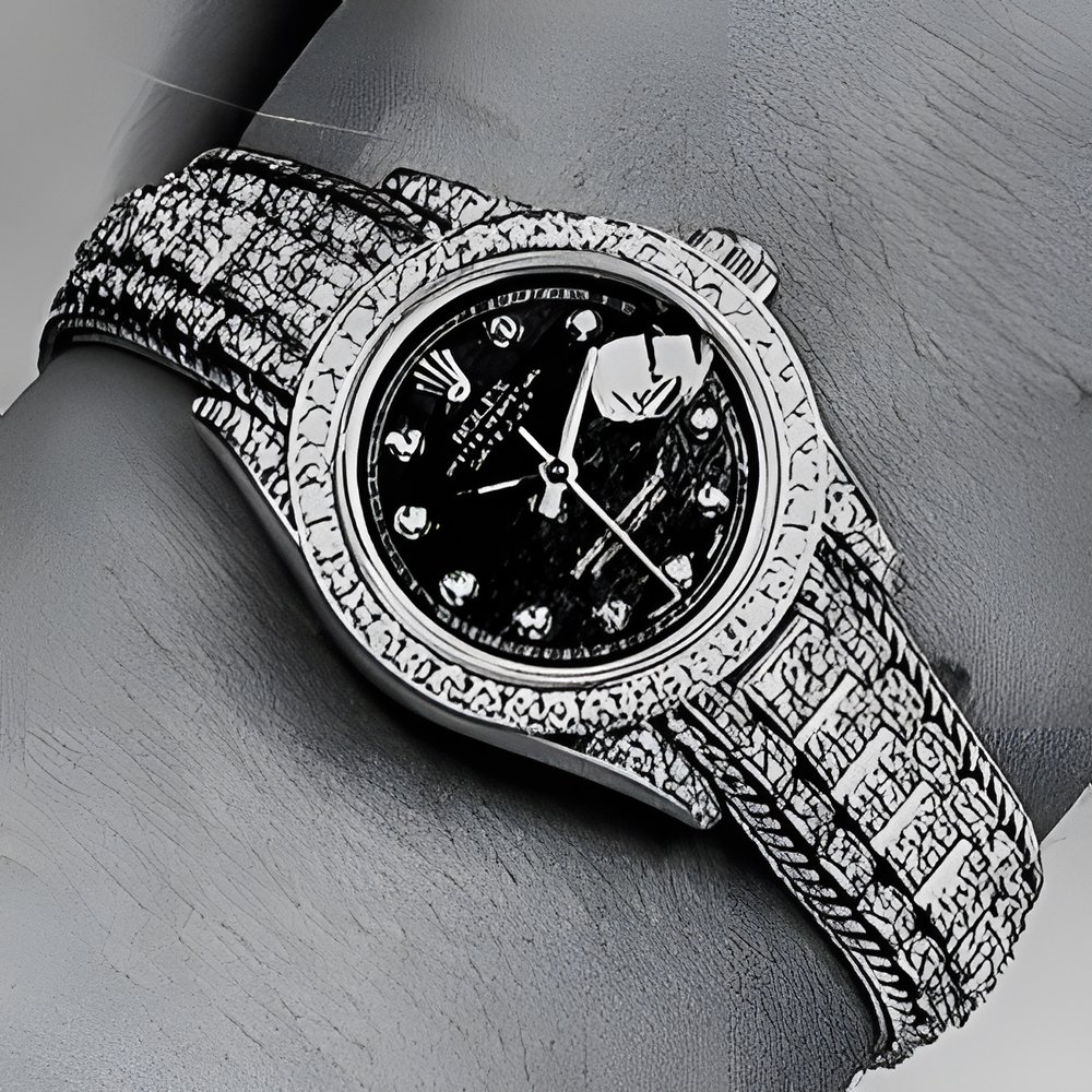 Created for Montres et Bijoux Genève 1989, this Lady-Datejust type Rolex model comes in yellow gold, with case horns, bezel and bracelet enhanced with 268 round diamonds (approx. 2.13 carats) while its ferrite dial (black flecked with white) carries ten diamonds. (ROLEX)