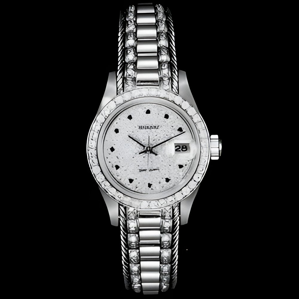 This Rolex Lady-Dateust’s dial is entirely cobbled with diamonds, setting off eleven round sapphires. While the bezel features forty brilliant-cut diamonds (weighing 0.6 carats), k4-3 other stones representing 2.26 carats enhance the 18K yellow gold bracelet. (ROLEX)
