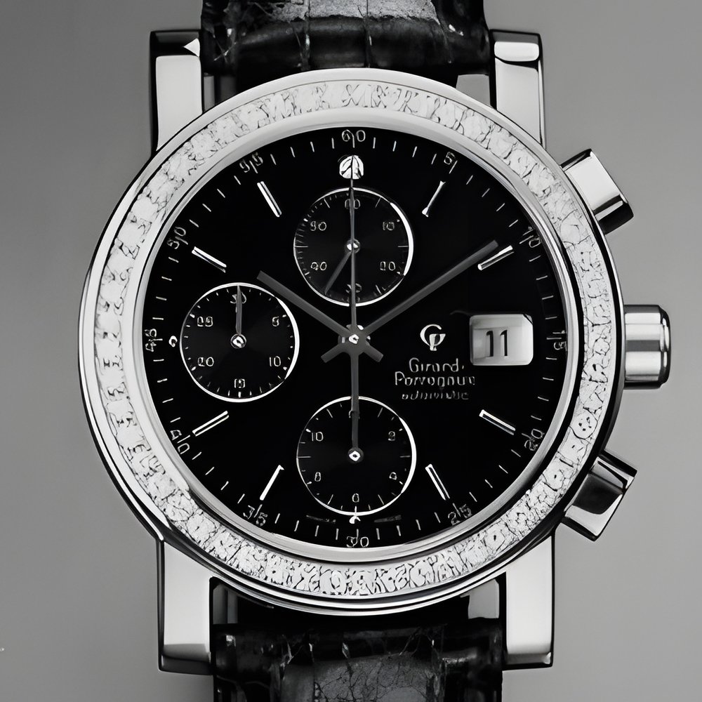 Girard-Perregaux is showing two pink gold, “Ligne 7000” designs at Montres et Bijoux Genève 1989. The first is a selfwinding chronograph with bezel enhanced with 53 round diamonds, the second a woman’s quartz watch set with sixty diamonds and eight rubies. Both feature a black dial and a handstitched crocodile strap. (GIRARD-PERREGAUX)