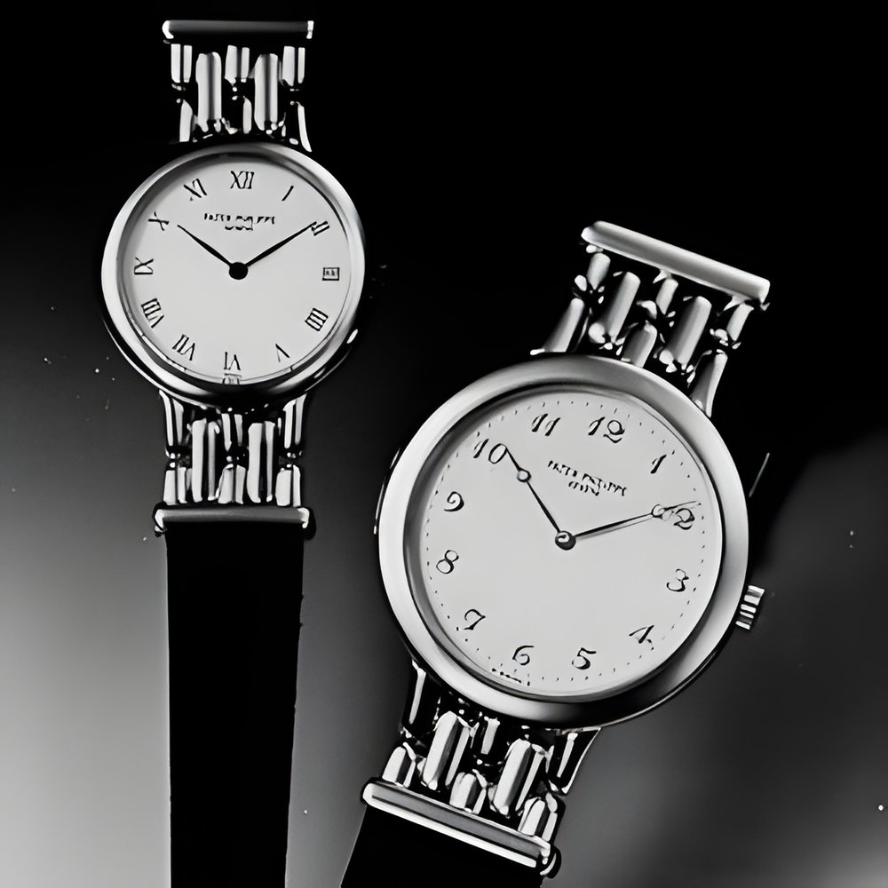 Two Patek Philippe designs in yellow gold, one for men, the other for women. Smooth, sleek-lined bezel and bracelet attachments, white dial with raised Breguet chapters or black painted Roman numerals. Man’s version with handwound mechanical movement, woman’s with quartz-piloted movement. (PATEK PHILIPPE)