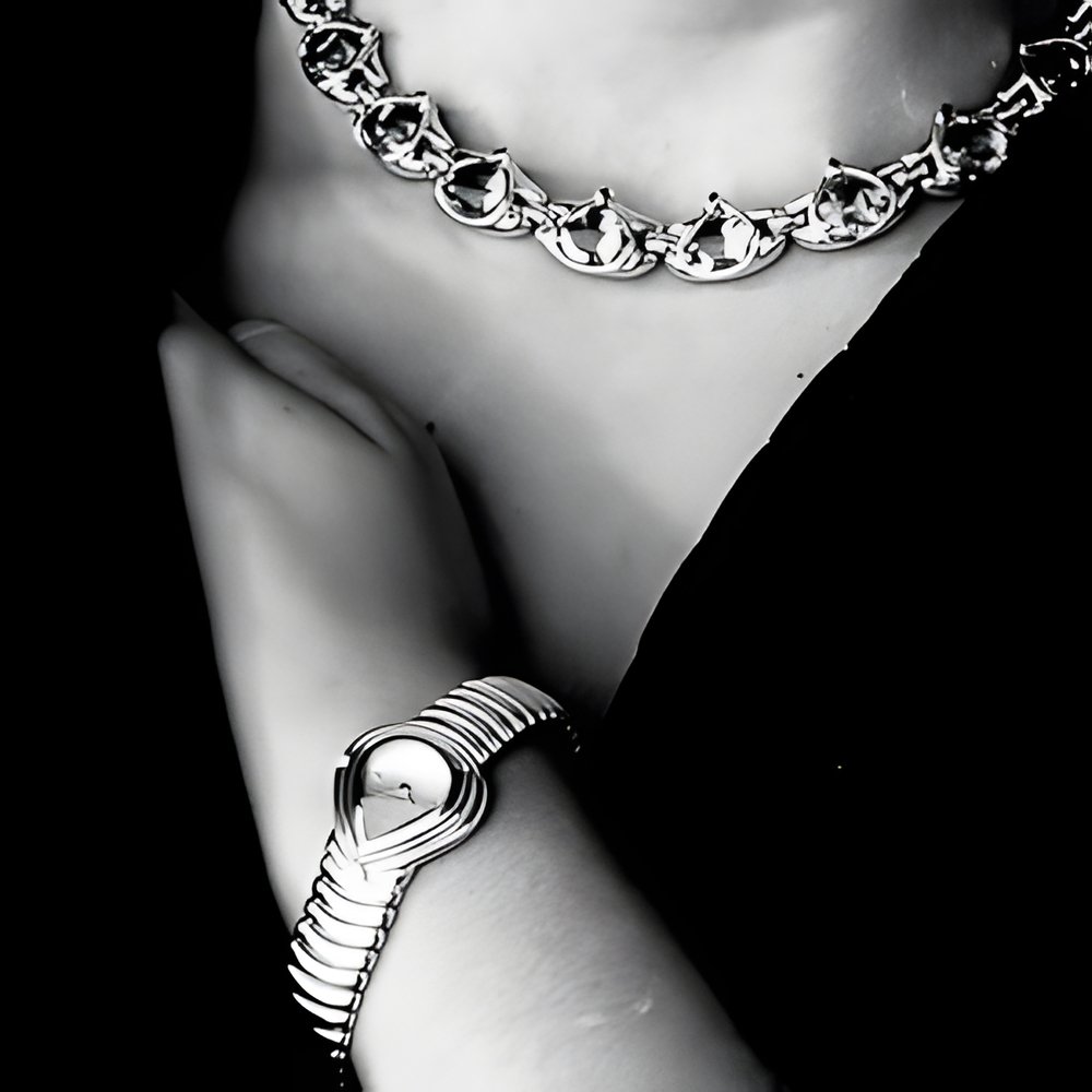 From Vacheron Constantin comes this jewellery set incorporating both novel shapes and unexpected combinations of gemstones. The teardrop shaped water-resistant case is in 18K yellow gold, set with a square diamond and fitted with an amethyst-hued corundum crystal. Extra-thin quartz movement. Also crafted in yellow gold, the necklace features ZO lightcoloured amethysts and 20 rubies, while the earrings are set with amethysts, tourmalines, rubies and diamonds. (VACHERON CONSTANTIN “Malte III”)