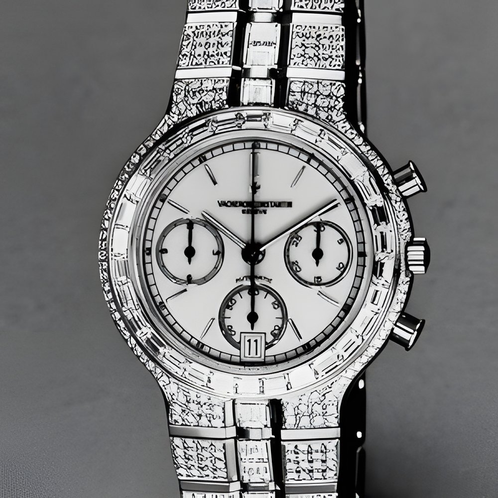 Vacheron Constantin’s “Phidias” chronograph features a platinum bracelet and a water-resistant platinum case set with baguette-cut diamonds and housing a handwound mechanical movement with hour and minute totalizers, : a small seconds subdial and a date calendar at 6 o’clock. (VACHERON CONSTANTIN “Phidias”)