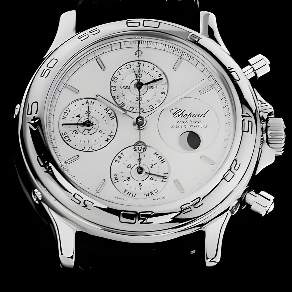 From the day it first opened for business, in 1860, Chopard Genève has taken pride in turning out exclusive, impeccably finished designs. Here is the latest and most sophisticated of its creations : a selfwinding chronograph fitted with a perpetual calendar that incjides a moon-phase indicator. Chopard has produced three series of this design, each limited to 50 : in platinum, in 18K yellow gold and in 18K pink gold. The winding rotor is in 21K gold, while the hands, dial, crown and pushpieces are fashioned from 18K gold, the strap buckle metal matching the waterresistant case’s. 437 parts make up the high-frequency (28’800 v.p.h., or 4 Hz) movement. (CHOPARD GENEVE)