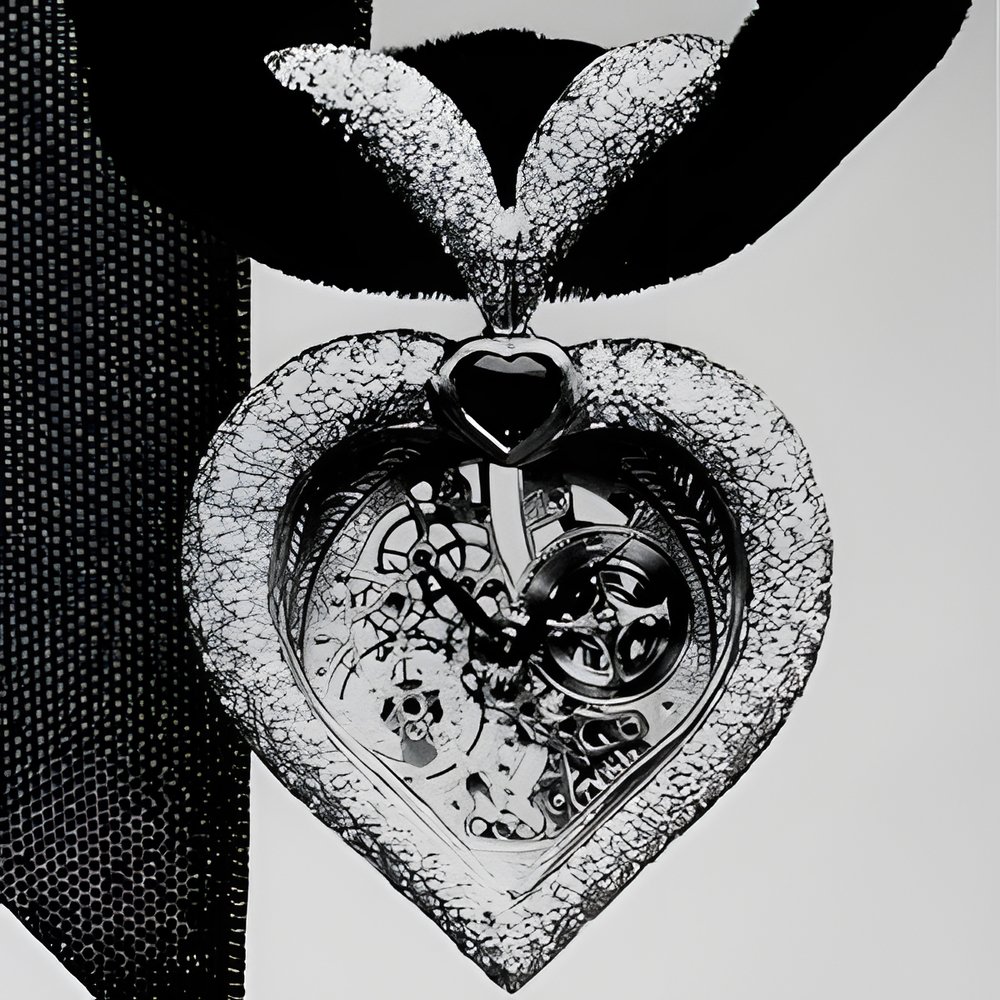 Heart-shaped pendant fastened on a velvet ribbon by an attachment paved with brilliant-cut diamonds. The “heart” itself is entirely set with 203 brilliant-cut diamonds and decorated with a heartshaped emerald. The watch features an open-worked and hand-engraved “skeleton”-type movement in 1L-karat gold. (AUDEMARS PIGUET)