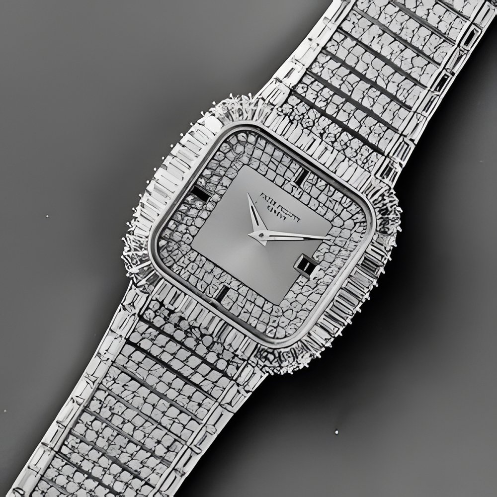 Superb gem watch for men, with bracelet (“rivière” type) and case set with 16 baguette-cut diamonds and 768 brilliant-cut diamonds (19.75 carats in all) mounted on 18-karat yellow gold. Yellow-gold dial with exterior zone paved with brilliant-cut diamonds and set with 3 baguette-cut sapphires. (PATEK PHILIPPE)