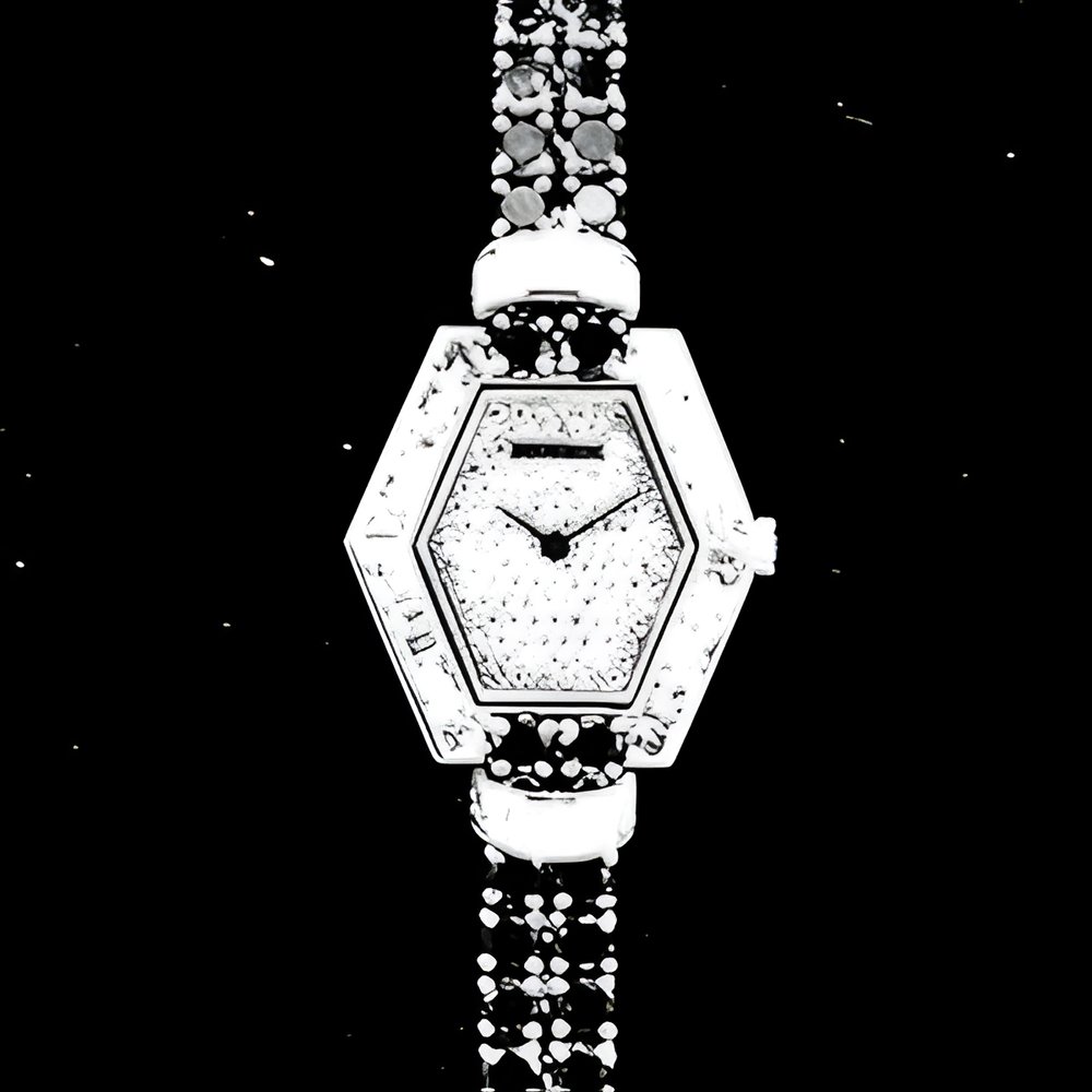Superb luxury jewellery design : a “rivière” of rainbow sapphires. It comprises two rows of baguette-cut sapphires displaying the full spectrum of the rainbow hues. In all, 82 baguettes (about 20.39 carats). The bezel and the bracelet attachments are set with 30 baguette-cut diamonds (about 4.75 carats). The dial is paved with brilliant-cut diamonds. (ROLEX)