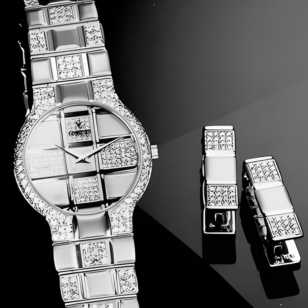 Cem watch in 18-karat gold for men from the new “Pavés de Concord” collection. The round bezel is ablaze with brilliant-cut diamonds, and the checkerboard motifs continue on both the dial and the bracelet composed of small plates suggestive of tiny pavés. Quartz movement. Matched cuff-links studded with brilliant-cut diamonds in alternating arrangements to repeat the watch’s decorative pattern. (CONCORD)