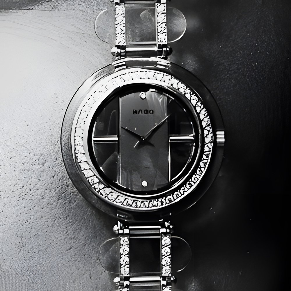 This watch for men is highly original. The bracelet features a 18-karat yellow-gold structure with sapphire motifs. The case, in yellow gold mounted on sapphire, is water-resistant to a depth of 30 meters. Bezel and bracelet structure set with 152 diamonds. Gold dial. (RADO)