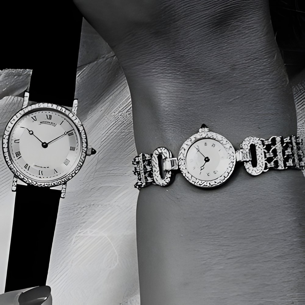18-karat yellow-gold wristwatch for women. Breguet-type dial with zones and hand-engraved gui1loch patterns. Bezel, attachments and small bars of the bracelet are set with brilliant-cut diamonds. The man’s model in 18-karat yellow gold, with leather strap, also features the typical Breguet dial with zones and hand-engraved guilloché patterns. Bezel studded with brilliantcut diamonds. (BREGUET)
