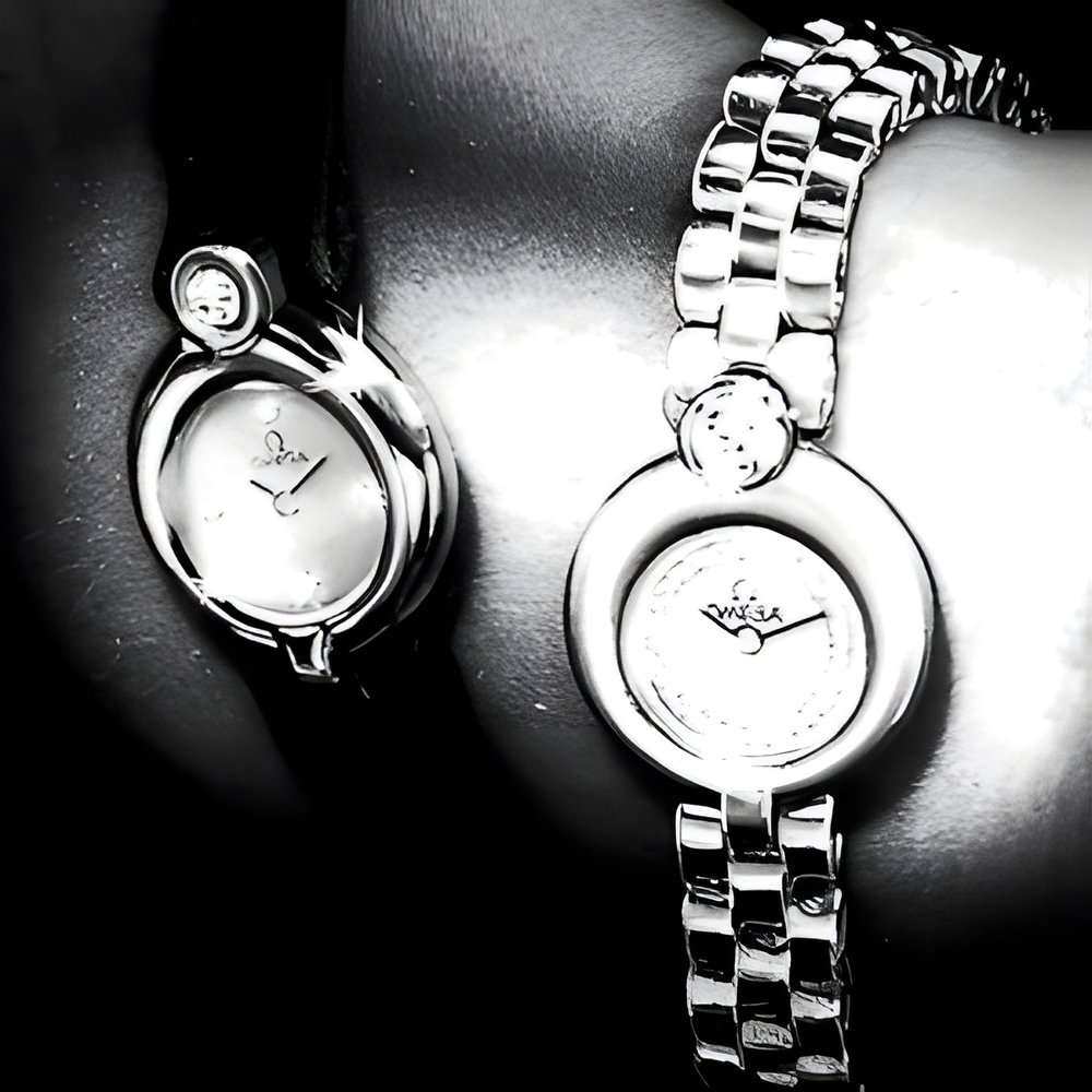 The “Solitaires” collection from Omega allows you to choose the decorative pattern of your watch thanks to an interchangeable collet set with the gemstone of your choice : diamond, ruby or emerald. You can also have your initials, armorial bearings or zodiacal sign engraved on the collet. The watch its in polished 18-karat yellow gold, and the collet is set with a solitaire diamond (0.12 carat). The red bracelet is made of leather and velvet suede. The bracelet-watch is in satin-finished 18-karat yellow gold. The collet is set with a solitaire diamond (0.33 carat). The chain-bracelet is composed of 64 hand-made and hand-mounted gold rings. (OMEGA)