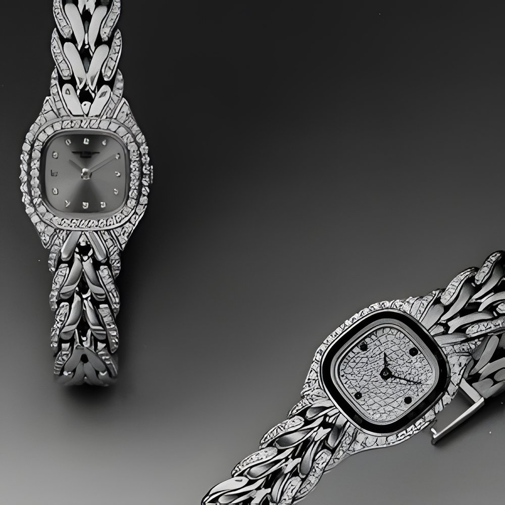 Two new Patek Philippe models from the “Flamme” line featuring an 18K yellow gold frame. Left : adorned with diamonds, with sunray patterned gilt dial set with twelve diamond hour markers. Right : set with diamonds and baguette-cut sapphires, diamond pavé dial with four sapphire cabochon hour markers. The bracelet links are connected in dovetail fashion. (PATEK PHILIPPE)