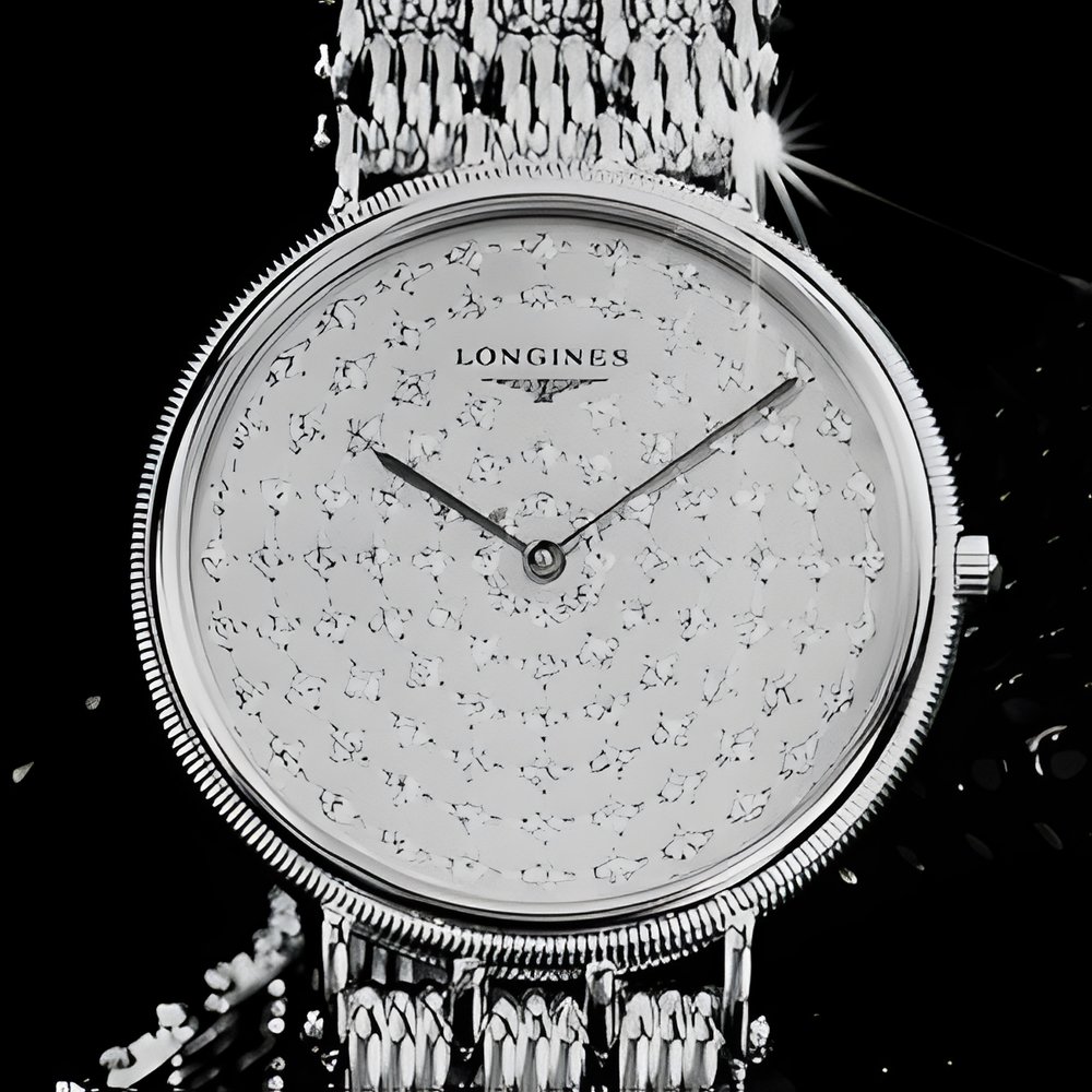 Two Longines designs in 18K gold, fitted with a quartz movement. Their bracelets are composed of meticulously polished articulated links ending not with the traditional gold tips but with flush-set diamonds. The watchcases’ fluted middles contrast stylishly with their rounded, gloss polished bezels. Sunray-pattern dials add a further grace note : the man’s version Is cobbled with 104 diamonds, the woman’s with 76 stones, all three-claw set. (LONGINES)