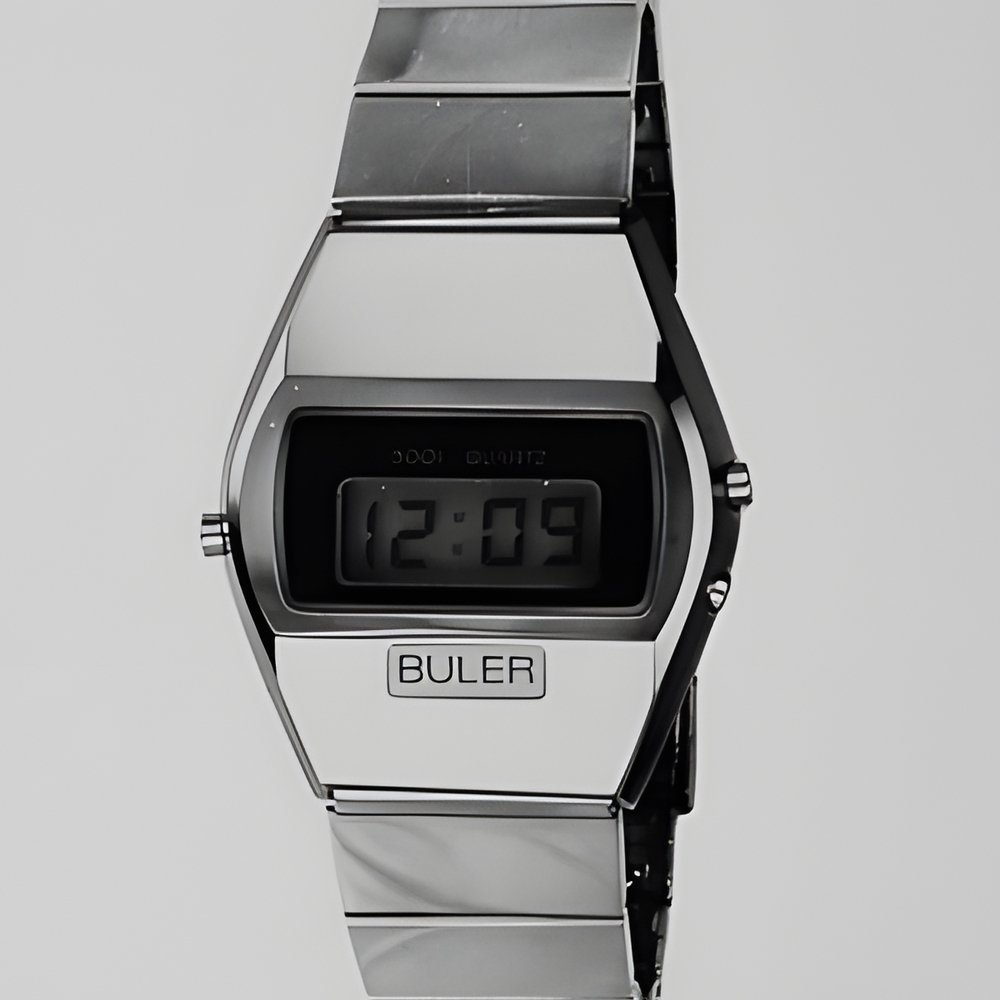 A model from the complete collection of quartz electronic watches presented by Buler at the 1976 Basle Fair. LCD, 5 functions, illuminated dial for night viewing, steel bracelet. (BULER)