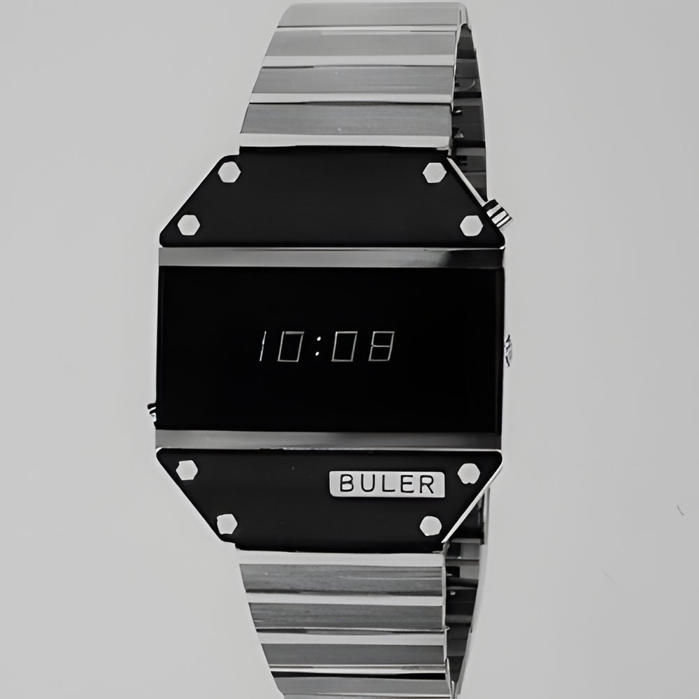 A model from the complete collection of quartz electronic watches presented by Buler at the 1976 Basle Fair. LED, 5 functions, steel bracelet. (BULER)
