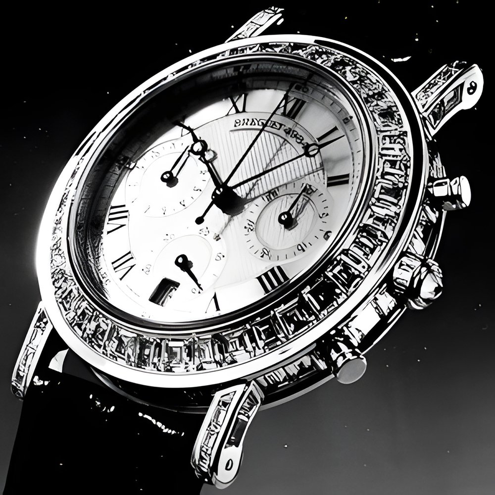 Breguet’s selfwinding “Marine” chronograph now comes in baguette diamond dress. Bezel, attachments and case middle are paveed with 95 stones (weighing about 9 carats). Mother-of-pearl dial and setting crown enhanced with a diamond cabochon. The Breguet “Marine” chronograph is waterresistant to 30 m. (BRECUET “Chronographe Marine” - ref. 3481)