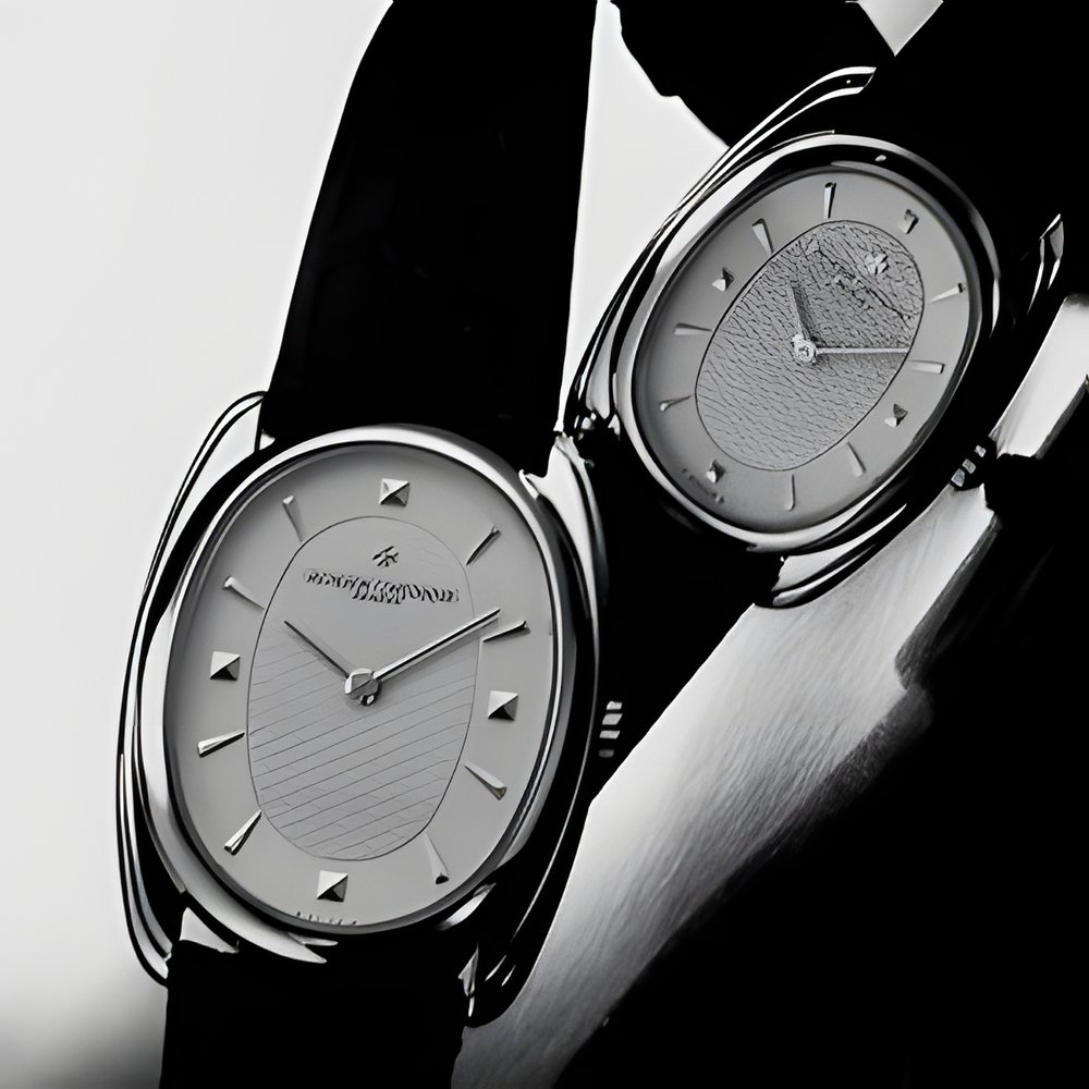 This pair of wristwatches for women and for men, from Vacheron Constantin’s “Les Historiques” line, is equipped with a handwound mechanical movement. Their elegant, elliptically shaped and godrooned case is crafted in 18K gold. The dial plate is gold, silvered and engine-turned. (VACHERON CONSTANTIN “Les Historiques”)