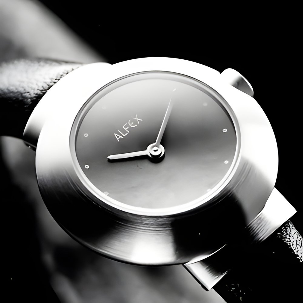 This highly original, strongly styled two-tone feminine watch features a palladium and 5-micron goidpiated case that is water-resistant to 30 m. It is equipped with an ETA Swiss Quartz movement. Its dark gray dial is protected by a cambered hesalite crystal. Sold with black leather strap with steel clasp. The design is available in a choice of three styles.