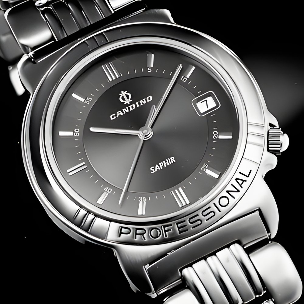 Designed for men on the fast track, displaying today’s trendy colour schemes, Candino’s new « Professional » model line provides excellent value for money. The model pictured here features a Swiss Quartz movement with battery end-of-life (EOL) indication. Case with screwed-in back, scratch-resistant sapphire crystal. Setting crown stem fitted with unusually positoned double O-Ring gaskets. A steel or two-tone bracelet contributes to the design’s exceptionally innovative styling.