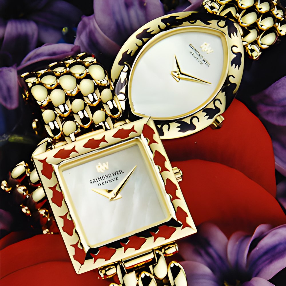 New decorative and colour schemes enhance this pair of women’s watches from Raymond Weil. Fitted with a bezel displaying red or blue translucent enamelled fish or swan motifs that adds an exclusive grace note. Equipped with a quartz movement, their oval or square 18K goidpiated case is water-resistant to 30 m. With matching goidpiated bracelet and a mineral crystal protecting their genuine mother-of-pearl dial.