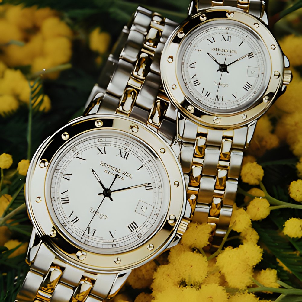 This pair of two-tone «Tango» design for Rim and for Her has recently joined the vast and varied Raymond Weil collection. Designed and built in accordance with traditional craftsmanship, their steel case with protected crown is water-resistant to 30 m and contains a movement with date calendar and hour, minute and seconds hands Gilt bezel enhanced with 12 polished studs. White dial with black Roman numerals and twin minute tracks protected by a mineral crystal. Comfortably wrist-hugging articulated goidpiated steel bracelet.