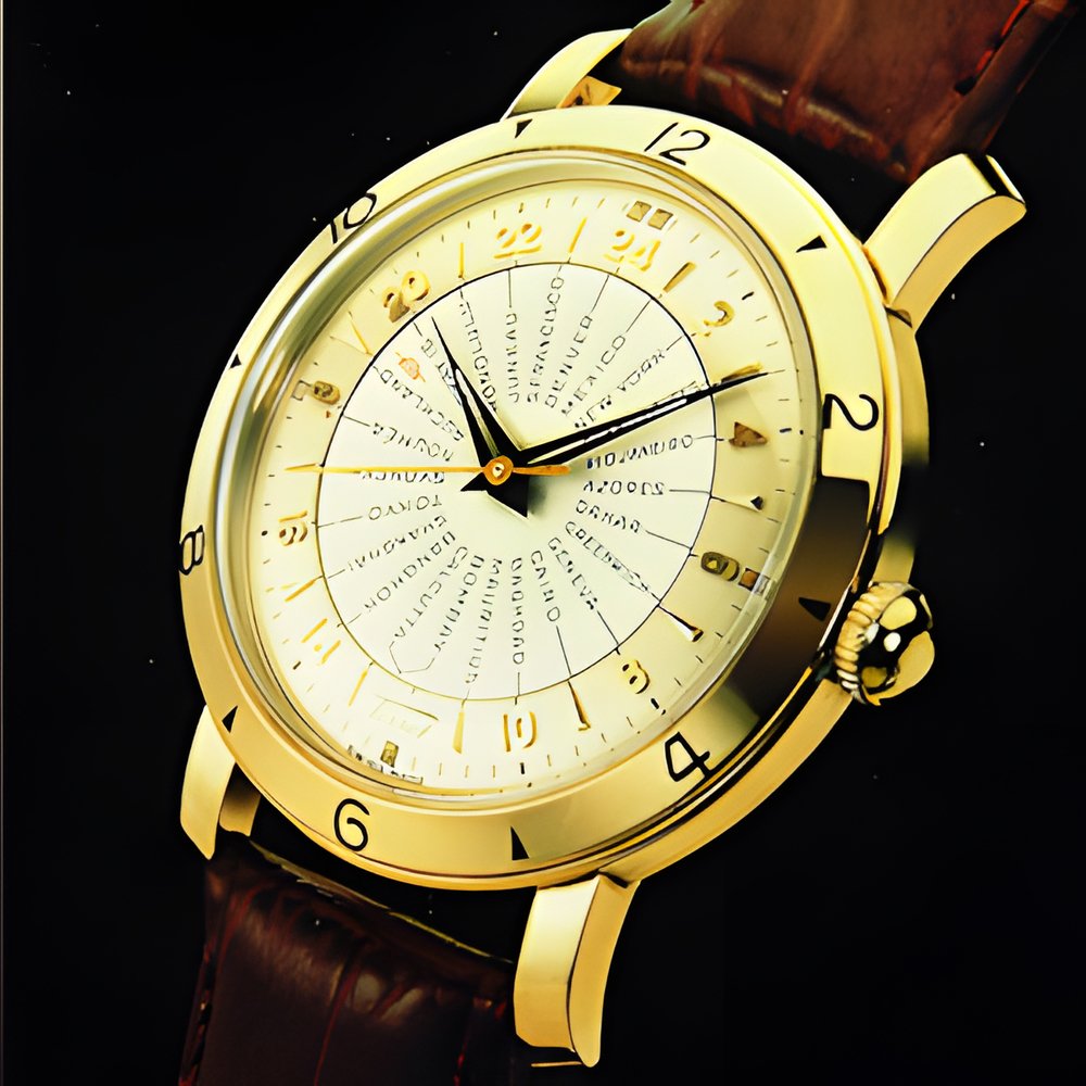 A replica of a 1953 design but equipped with a late-model selfwinding movement, this double-timezone watch is available in limited editions, numbered 0001 to 1000 in 10-micron goldplate and from 1001 to 2000 in steel. Case water-resistant to 30 m, with hesalite crystal and screw-locked back. A rotating disc at centre on the dial carries the names of major world centres while the 24-hour cycle is inscribed on the dial rim.